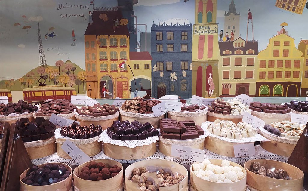 Інтер’єр Майстерня Шоколаду виконаний у приємних шоколадних тонах, які ще більше підсолоджують настрій відвідувачів.